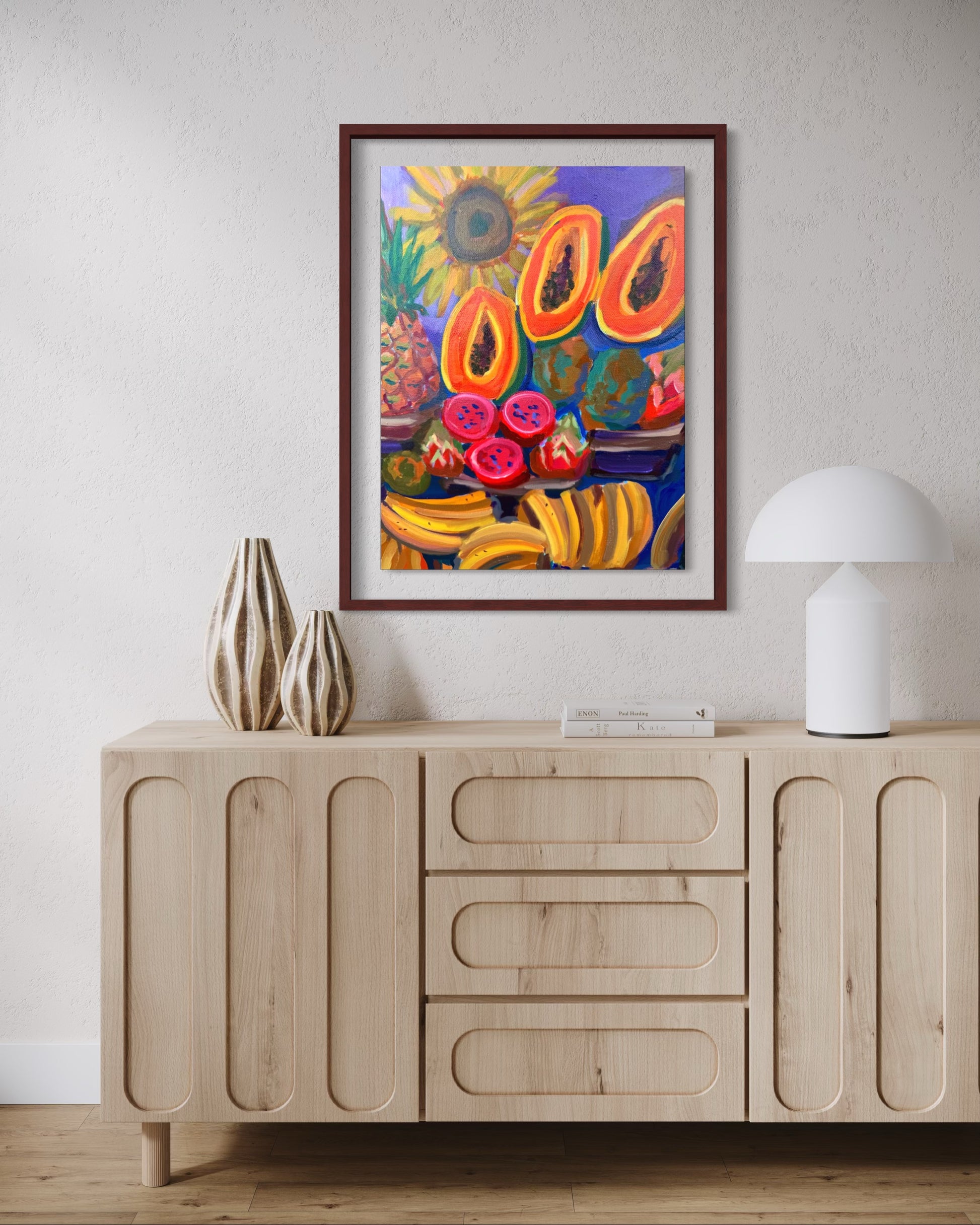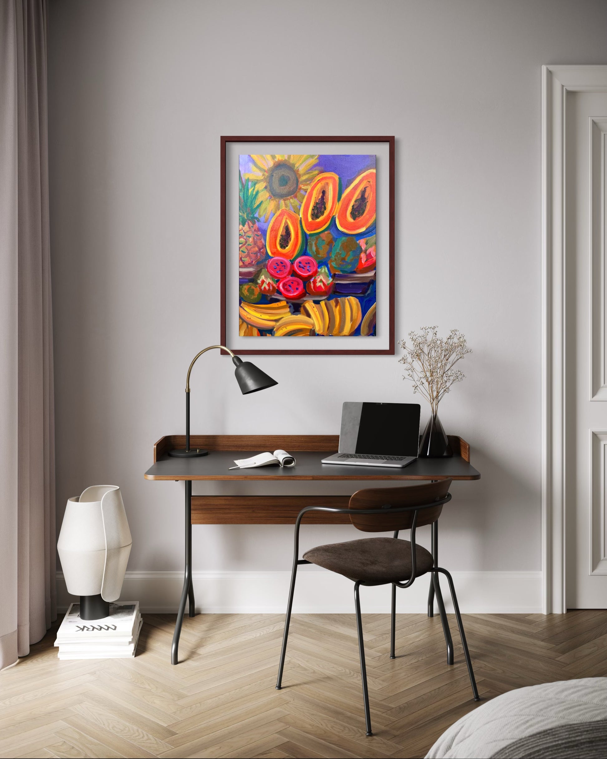 A radiant celebration of tropical abundance, Papaya & Bananas captures the lush vibrancy of island life through bold, sunlit color. The rich orange papayas and golden bananas burst against a backdrop of warm tropical light, embodying the freshness and rhythm of the Caribbean. Each brushstroke reflects the warmth, sweetness, and joy of everyday beauty found in local markets and island kitchens.